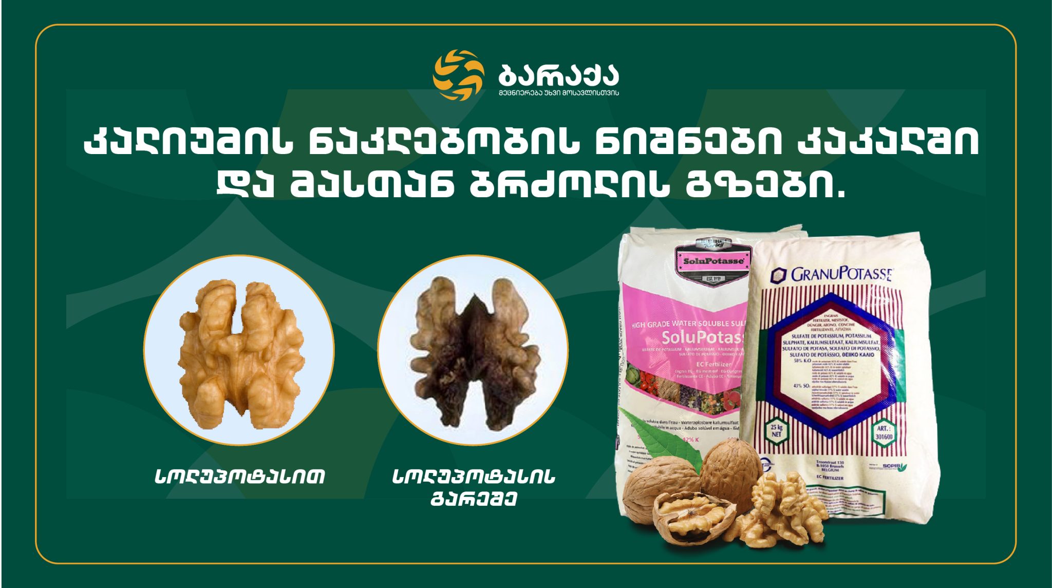 To obtain high-quality walnuts, it is necessary to use potassium fertilizers. Agrocompany Baraka recommends using granupotas and solupotas from the Belgian company Tessenderlo Kerley to eliminate potassium deficiency.